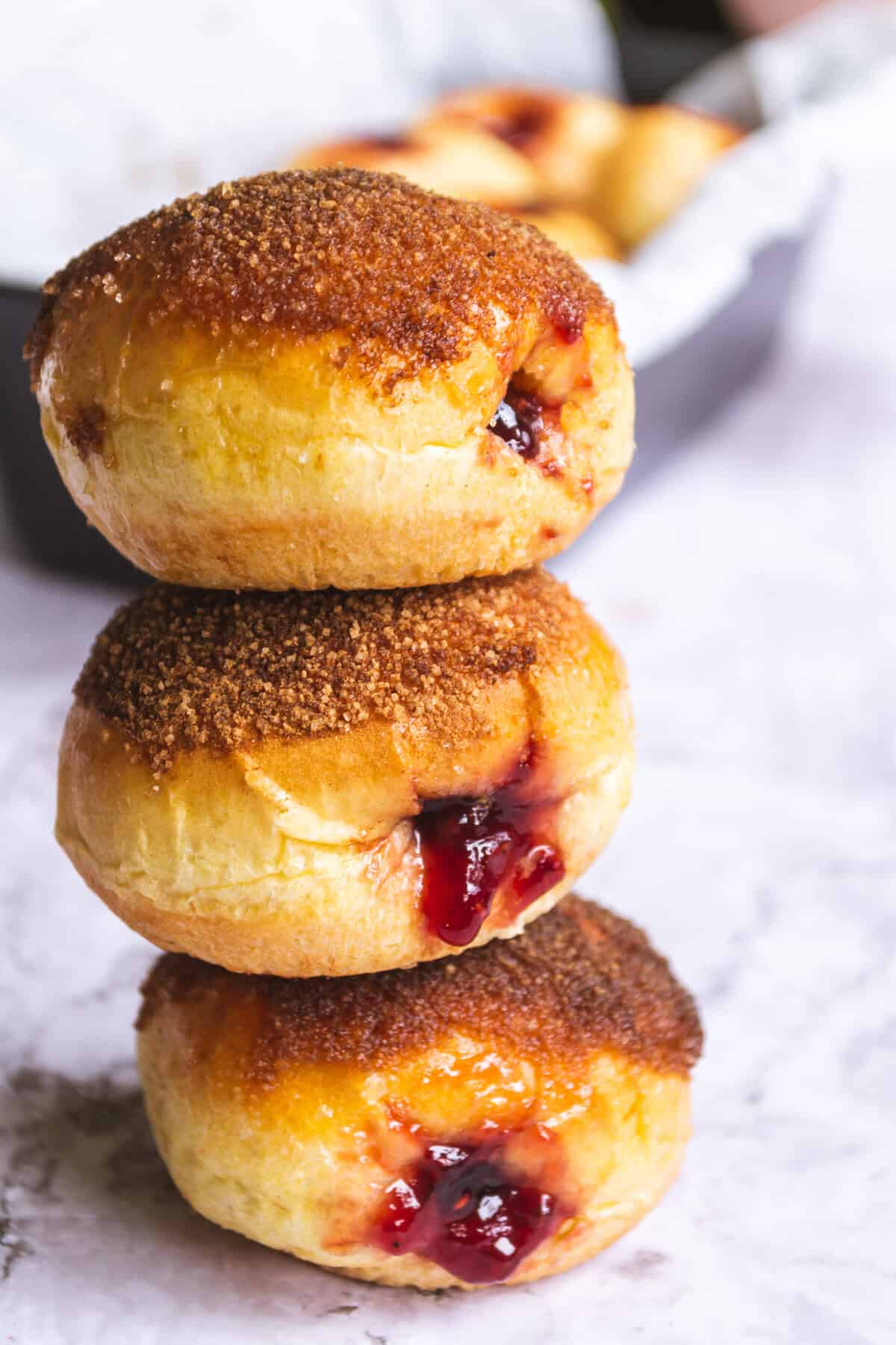 Though not 100% from scratch, these semi homemade donuts still taste divine and are sure to satisfy your donut desires. Trust us, the first time you bite into one of these fluffy, warm balls of goodness, your world will be changed. With a fluffy texture, gooey jam filling and sprinkling of cinnamon sugar on top, you'll be coming back for seconds.