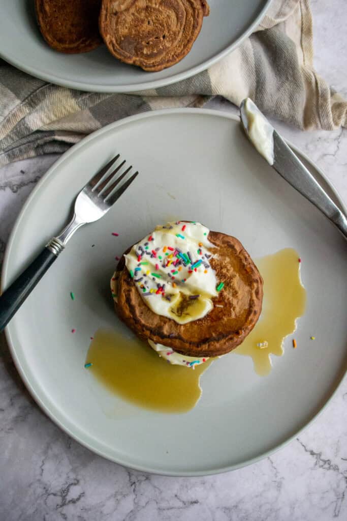 - Once all the pancakes are cooked, serve them warm and top with whatever you like! I topped mine with greek yogurt, maple syrup and sprinkles. Peanut butter, jam, and chocolate would also be delicious options (use sugar-free syrup/ chocolate/ jam if needed).