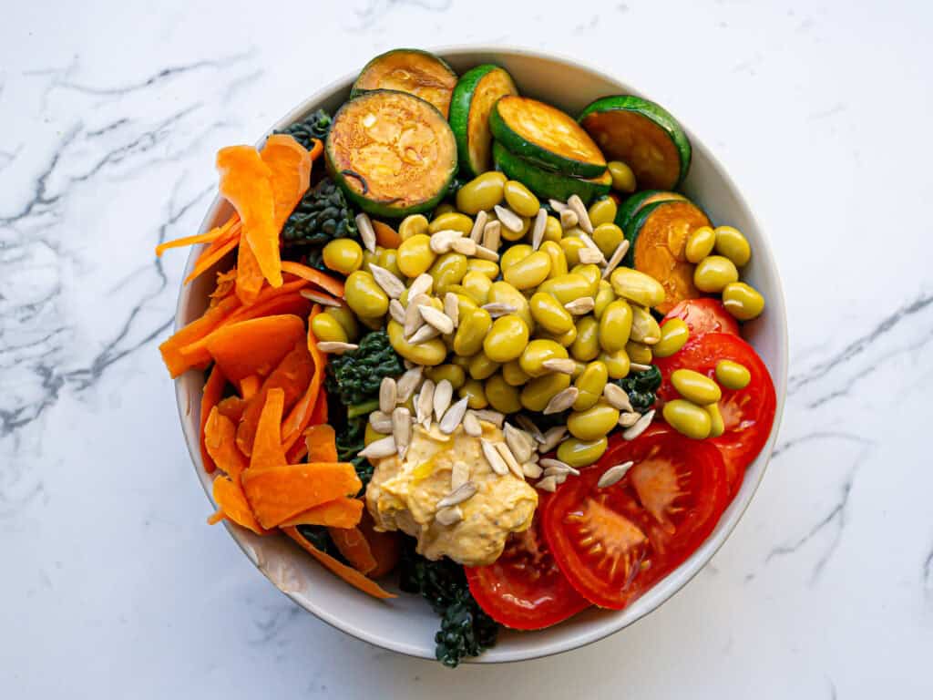 With plenty of veg, some hummus, and healthy fats from olive oil and sunflower seeds, this plant-based meal will leave you feeling satisfied all afternoon long.